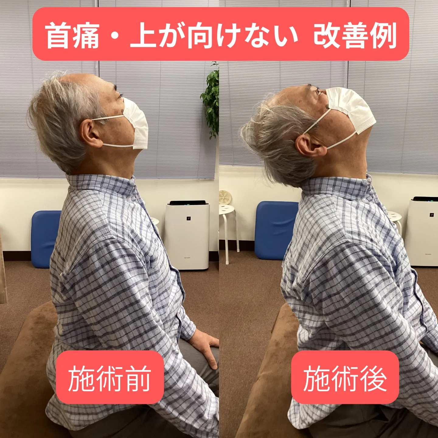 施術前は、首を後ろに倒そうとすると痛みが出て、