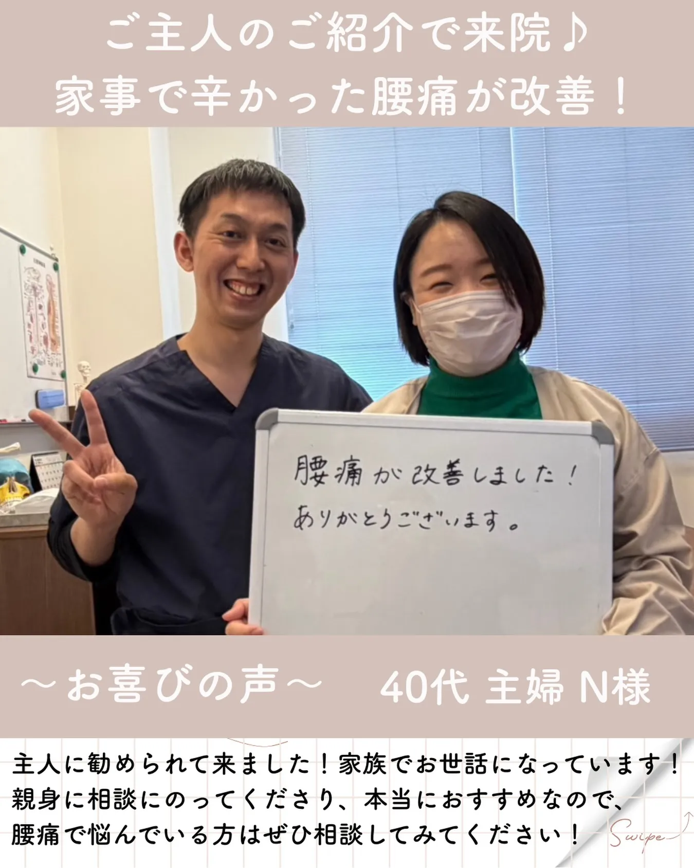 「家事でつらかった腰痛が改善しました!」とうれしいお声をいただきました。